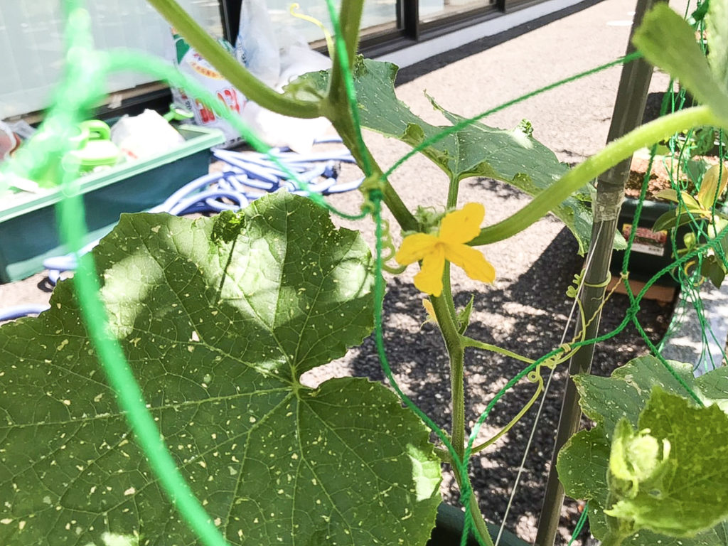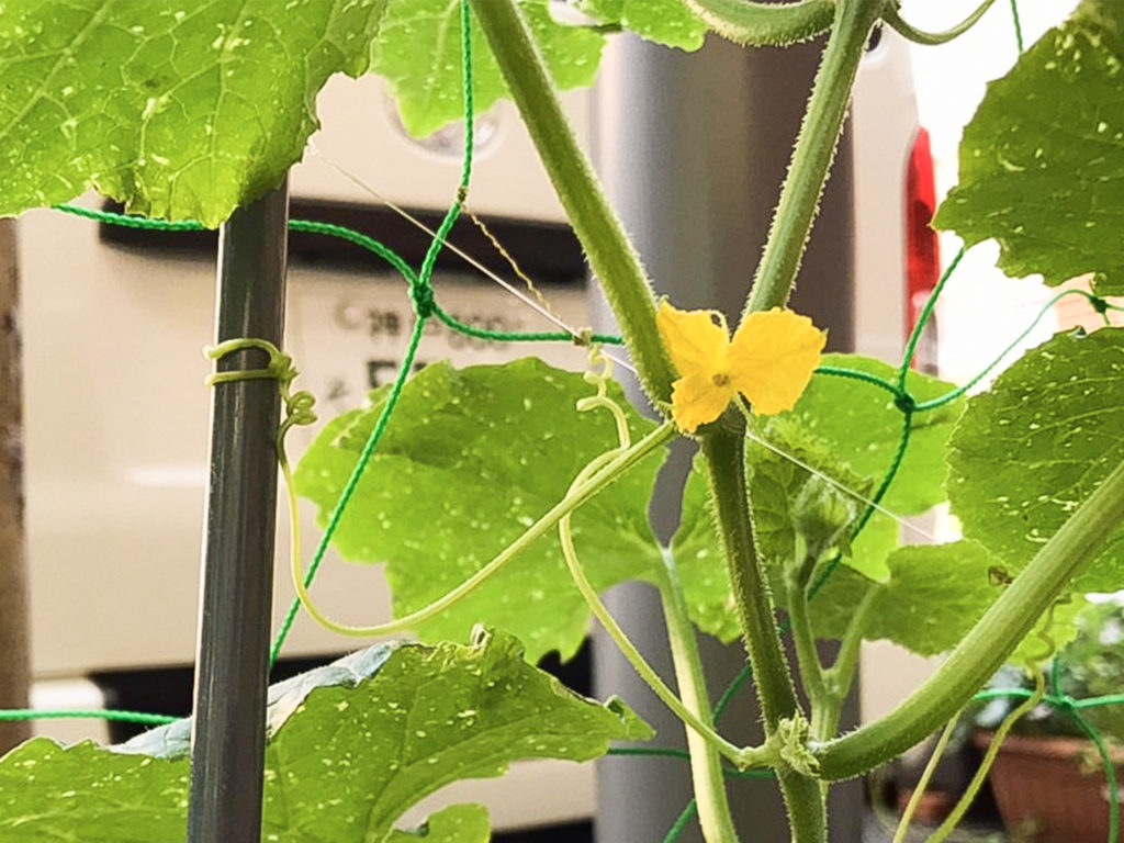 前回の様子から数日で、さらにきゅうりが急成長し、黄色い花が開花しました!