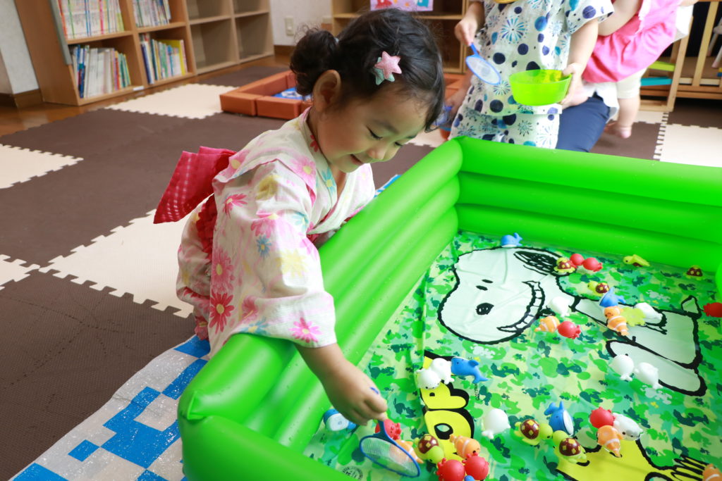 スタート!の合図として、みんなで「たなばたさま」の歌を元気よく歌い、七夕の話(織姫と彦星)のペープサートやスタッフが考えた出し物を披露したあと、室内にゲームコーナーを設けて、子どもたちはスタンプラリーをしながら、「人形すくい」「魚つり」「ボーリング」「風車づくり」とたくさんの遊びを体験してもらいました。なかでも人形すくいは、とっても人気で、上手にポイを持って人形をすくい続けたため、容器に入らないほど…すくっている子もいてびっくりでした!!