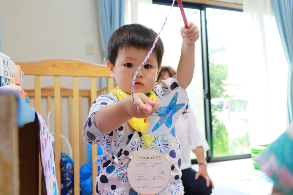 まだまだ小さい子は、保育士と一緒にお兄さんやお姉さんが釣ってくれた人形で遊んだり、風車がぐるぐると回る様子を見たり、シールでデコレーションをして楽しみました。