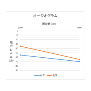 この「音の大きさ」と「音の高さ」を測定して聴力検査を行います。当院の健康診断では、1000Hzと4000Hzという2種類の音が使用して「右耳」と「左耳」を片方ずつ検査し、何デシベルの音量であれば聞こえるのかを測定します。