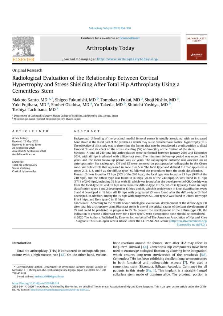 当院の整形外科に昨年まで勤務していた整形外科の神頭 誠(Dr.)が執筆した「Radiological Evaluation of the Relationship Between Cortical Hypertrophy and Stress Shielding After Total Hip Arthroplasty Using a Cementless Stem」論文が、この度「Arthroplasty today」という学会誌に掲載されました。