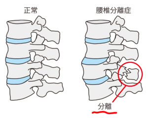 「腰椎分離症」とは、腰椎という腰の背骨を疲労骨折してしまう病気です。