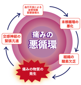 そうなると痛みの物質が産生されます。痛みの物質が産生されると、交感神経の緊張が強くなります。交感神経の緊張は、血管の収縮するように働き、負のサイクルにどんどん陥ってしまいます。