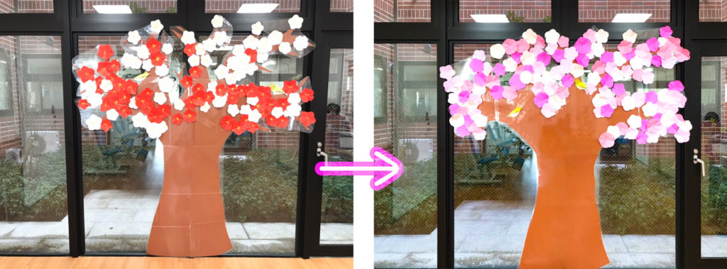 ですが、壁画の作成話から話題が増えたことで、作る工程も楽しめると考え、2020年は1本の木が季節ごとに変化する壁画にもチャレンジしました。