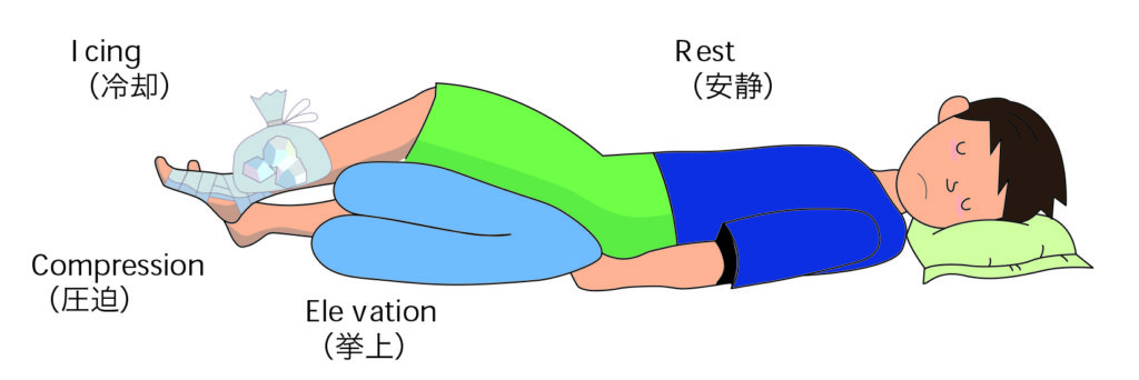 - Rest(安静)…血管・神経の損傷を防ぐ為に、添え木やテーピングなどで損傷部位を固定します。