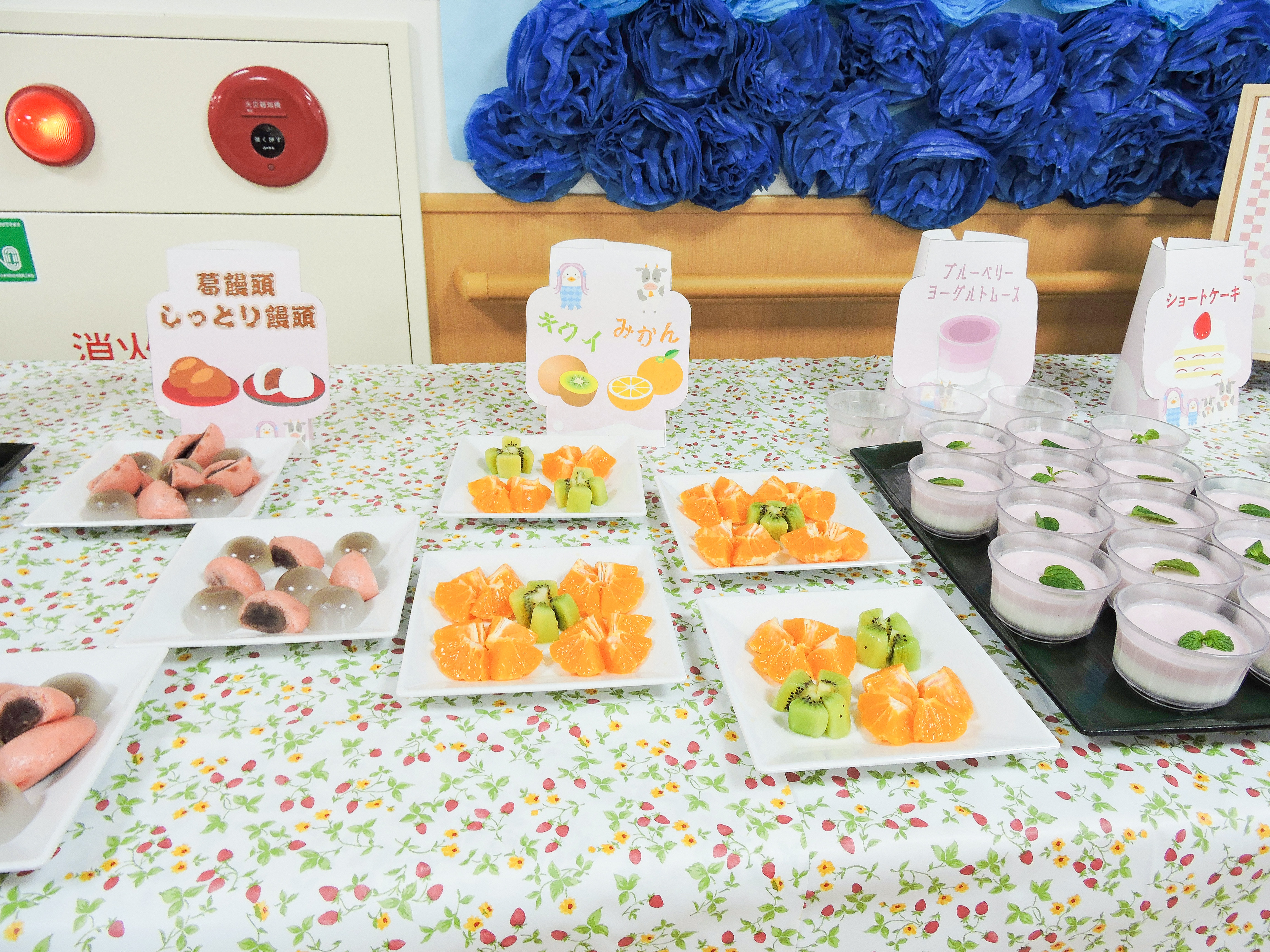 スイーツが並び始めると利用者さんが「どれを注文しようかなぁ」と視察する様子も見受けられました。まだまだ大規模なイベントが開催できない状態ですが、月に一度の「おやつバイキング」は今年も継続予定です。