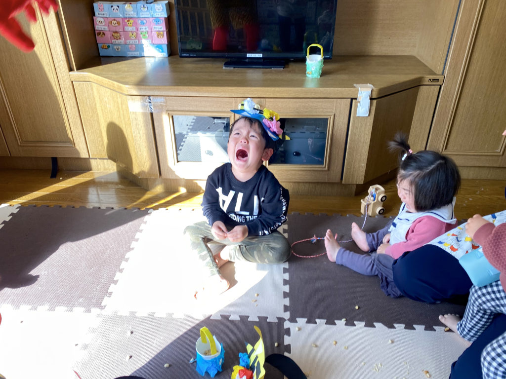 豆まきの練習をして、楽しく過ごしていた子どもたちは、鬼を見つけた瞬間に大号泣!!