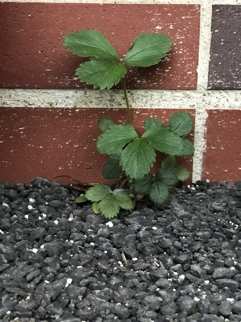 そして、順調に育っているいちごのプランターを日当たりの良い場所に移動させてみると…こちらも、とっても狭い場所で苗がひとつだけアスファルトから育っていました!!