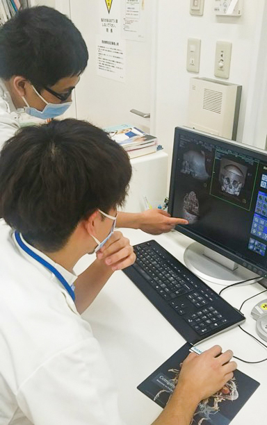今月は放射線部から、新人技師が頭蓋骨模型を用いてCT撮影を練習している様子です。
