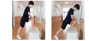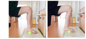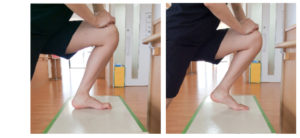 イスや台の上に片脚を乗せ、足先と膝の向きが真っ直ぐのまま、写真の様に足首を曲げていきます。