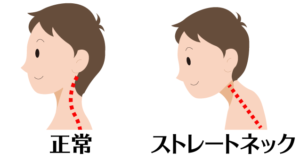 スマートフォンを操作するときやデスクワークでタイピングをする際など、ついつい前屈みの姿勢が続いたことで、首の骨(頚椎)が本来のゆるやかなカーブからまっすぐになってしまう状態をいいます。ストレートネックと呼ばれることもあります。