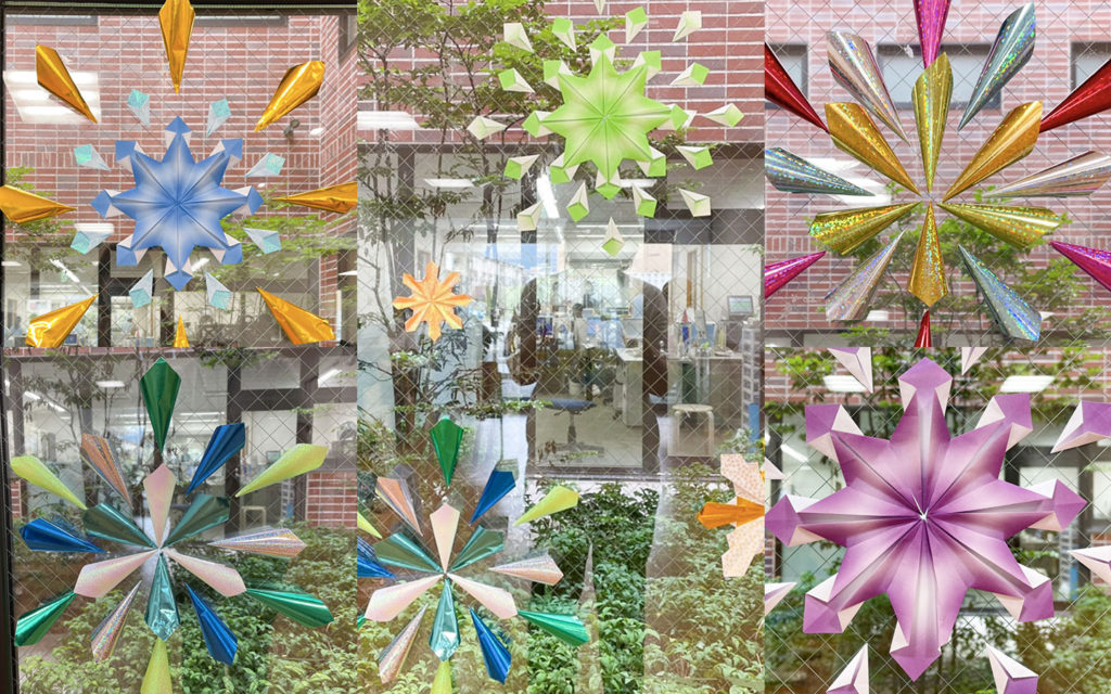7月末に咲かせたデイケア入り口のひまわり畑を少しアレンジし、8月の残暑を楽しむ壁飾りを作成しました。