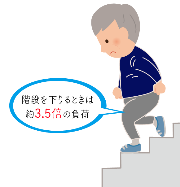例えば、平らな道を歩くときには体重の約2.6倍の負担がかかり、階段を下りるときは約3.5倍の負荷がかかります。