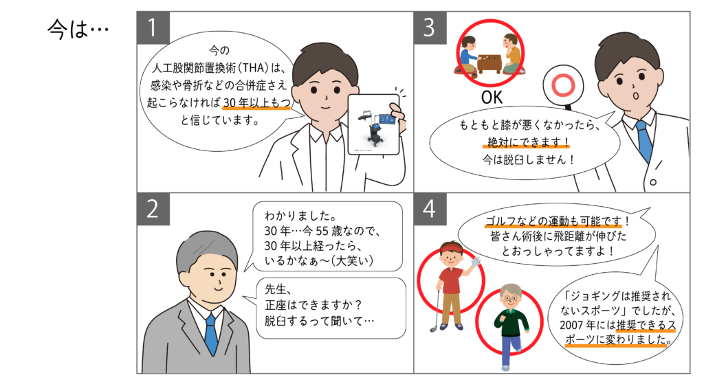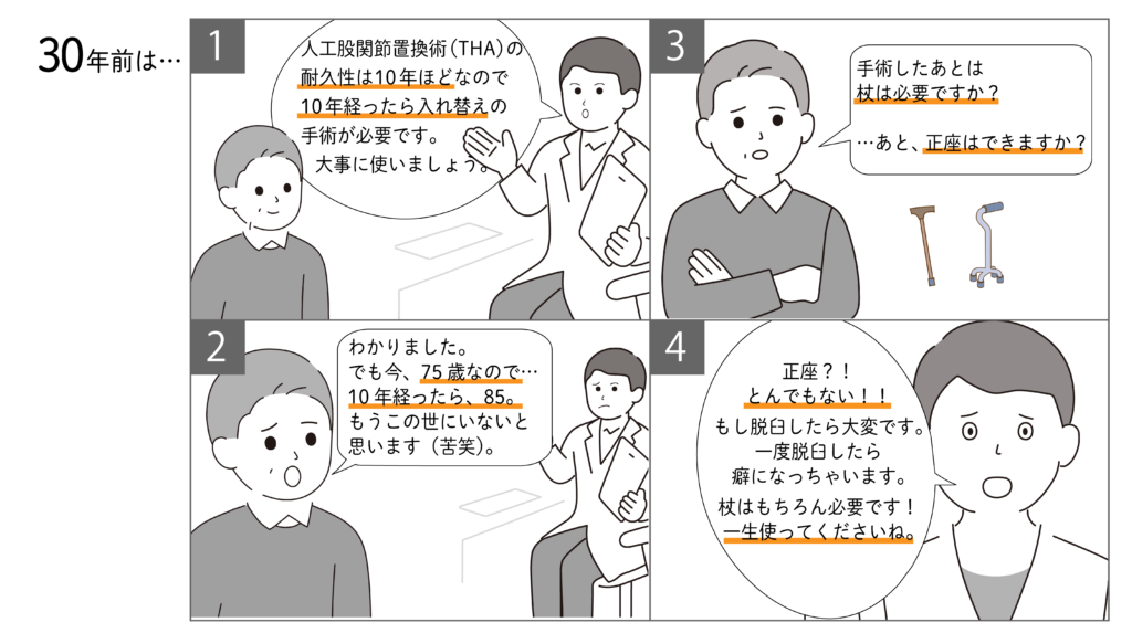 今から30年以上前…まだ私が整形外科で研修中の医師だった頃は、人工股関節置換術(THA)の手術前の患者さんに以下のような説明をしていました。