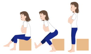 手を胸の前で組み、反動をつけずに立ち上がり動作を行うものです。