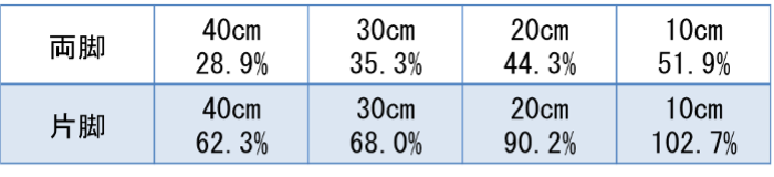 このテストは、両脚もしくは片脚で立ち上がることができる台の高さから、足の筋力、特に膝を伸ばす筋力を推定する方法です。