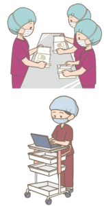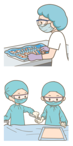 手術に必要な道具(器械)を事前に準備し、手術が開始すると執刀する医師の近くで手術器械をに渡したりします。