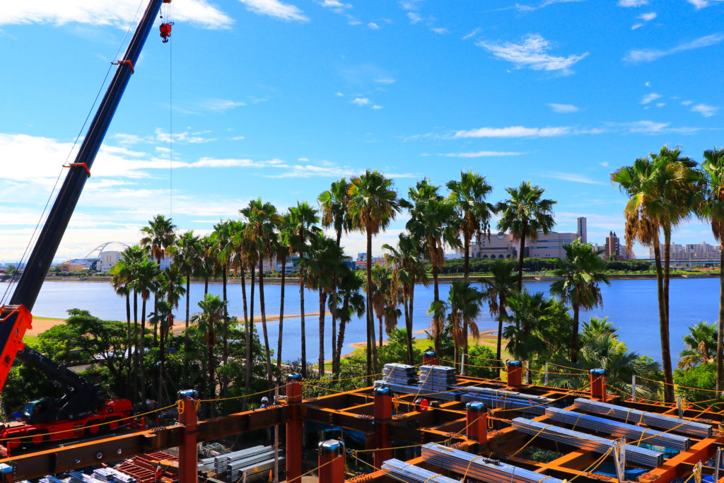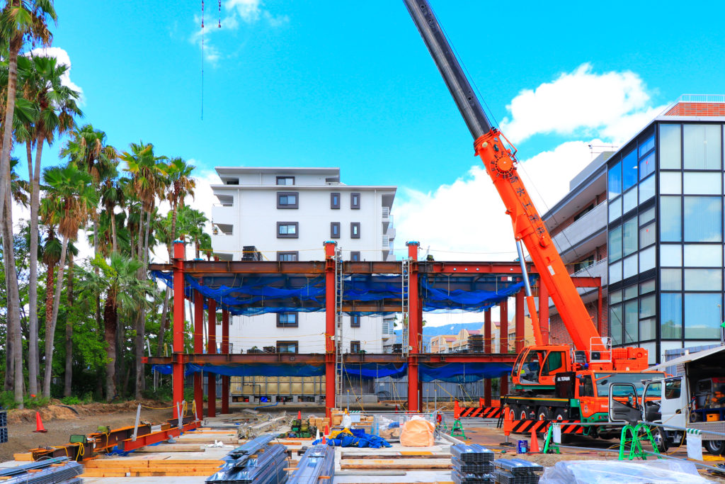現在は、鉄骨が少しずつ組み上がっています。ちょうど2階の高さが組み終わったようです。