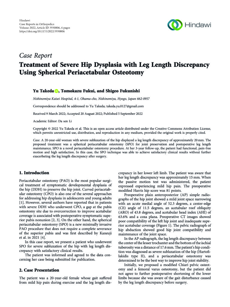 脚長差のある発育性股関節形成不全に対して執筆した「Treatment developmental dysplasia hip with leg length discrepancy using the sphere periacetabular osteotomy」論文が、この度「Case report in orthopedics」の学会誌に掲載されました。