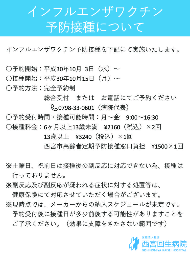 当院では下記のとおり、インフルエンザワクチン予防接種の予約受付を再開いたしました。