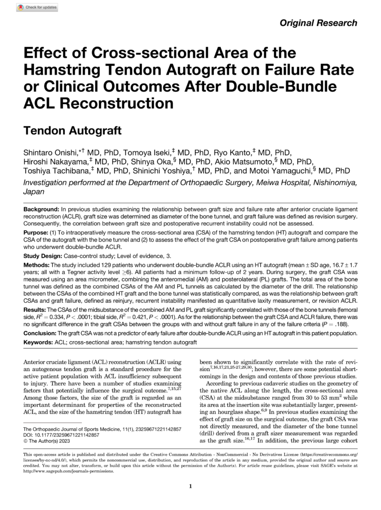 自家ハムストリング腱を用いた二重束前十字靭帯(ACL)再建術における移植腱断面積(CSA)が移植腱機能不全と臨床成績に及ぼす影響に対して執筆した「Effect of Cross-sectional Area of the Hamstring Tendon Autograft on Failure Rate or Clinical Outcomes After Double-Bundle ACL Reconstruction: Tendon Autograft」論文が、この度「Orthopaedic Journal of Sports Medicine」誌に掲載されました。