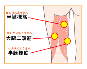 ハムストリングスとは、おしりの付け根から太ももの裏側、太ももから膝裏周辺にある、3つの筋肉(大腿二頭筋、半膜様筋、半腱様筋)の総称を指します。このハムストリングが硬くなってしまっている場合や筋肉が機能していない場合、おしりが痛くなったり、腰痛・膝痛の原因になりやすいと言われています。