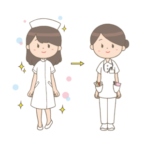 昔は看護師といえばワンピース型の白衣にナースキャップ、白色のストッキングに白のサンダルが当たり前でした。白衣やナースキャップに憧れた方も多いと思います。しかし必要性や衛生上の問題からナースキャップは廃止され、男女雇用機会均等法により男性看護師が増えたことで動きやすいパンツスタイルのユニフォームが取り入れられるようになりました。