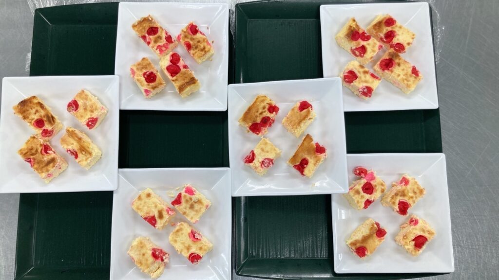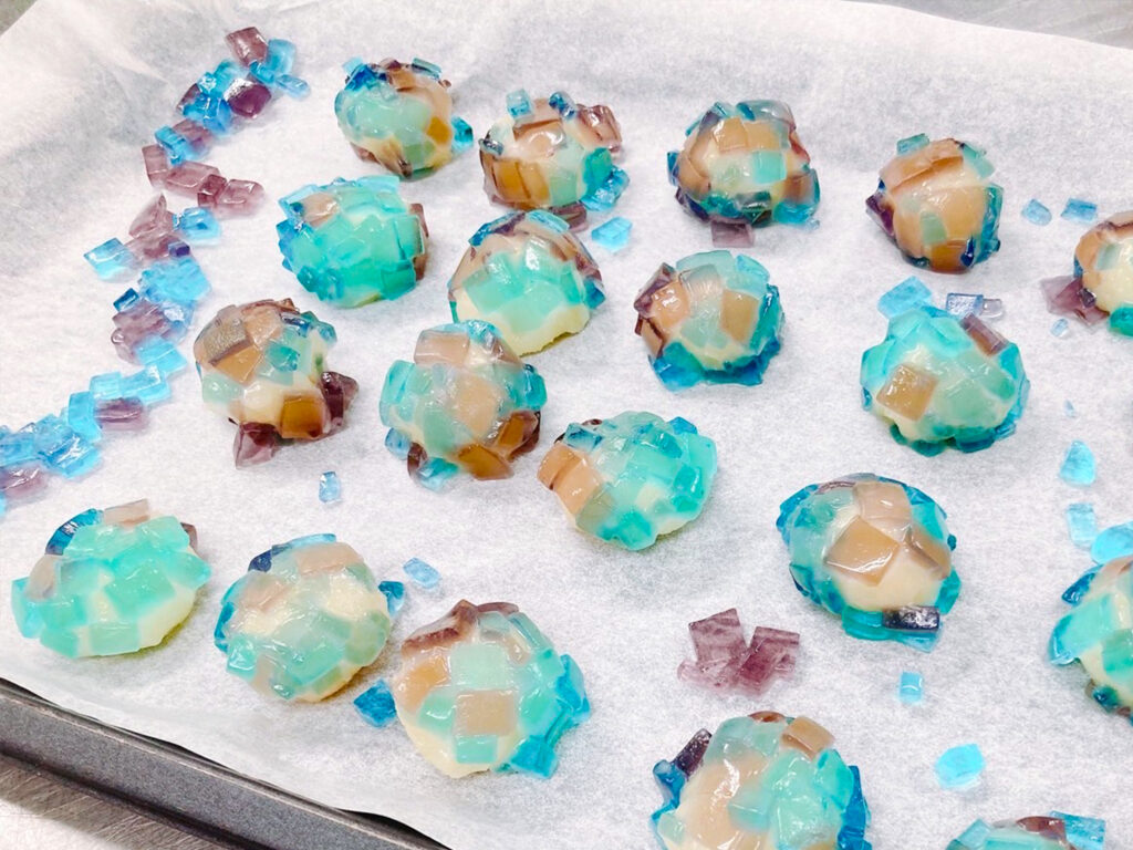 白あんの上にあじさい色のゼリーをのせて、涼しくて彩りがある見た目が印象的です。利用者さんも職員も「おぉ〜!!」と思わず声を出して覗き込んでいました。