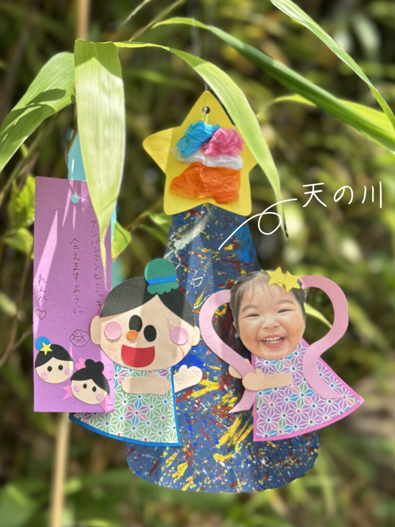 次に、天の川の上に彦星と織姫を飾ります。今回は織姫に自分の顔を貼りました!