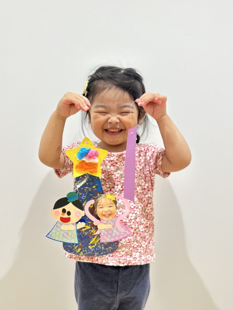 最後は星をつけて完成!! 願い事を書いた短冊を持つと、この表情でした。