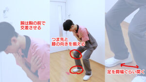 - 足を肩幅くらいに開き、つま先と膝の向きを揃える