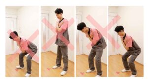 - 少し後ろの椅子に座るイメージで膝を約90度曲げるようにしゃがむ
