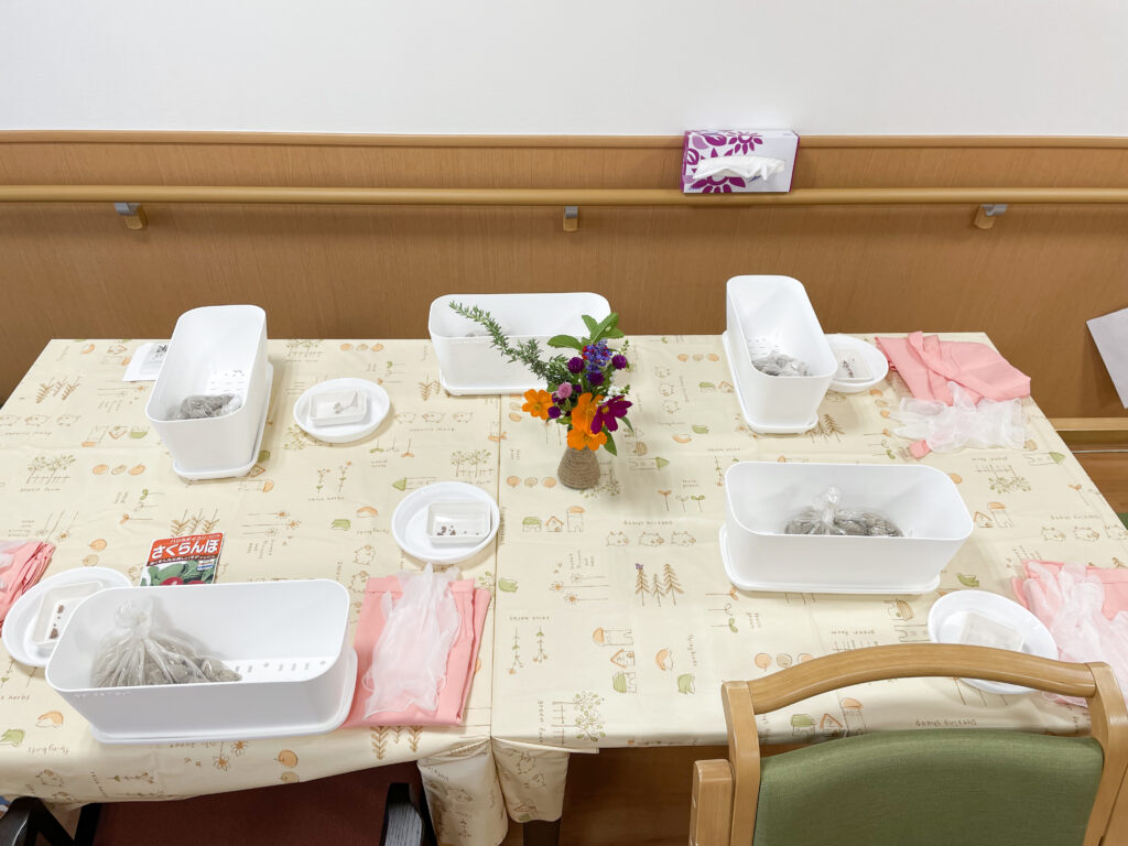 室内で植え付けや水やりができるスペースを設け、利用者さんは座ったままテーブルにて行っていただきます。今回は「さくらんぼ」の植え付け作業です。