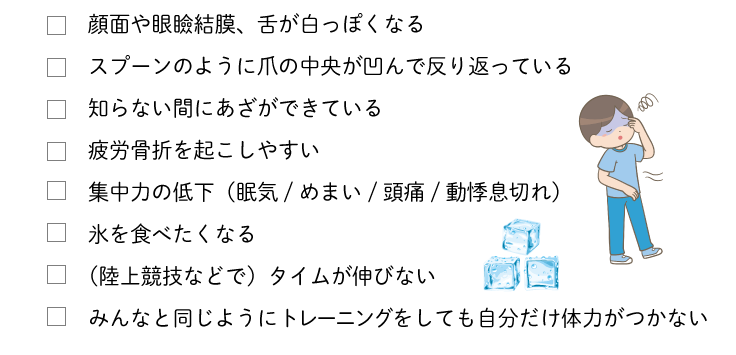 もし貧血だった場合は、強引なトレーニングを進めることで、さらに貧血症状が悪化する可能性やオーバーユースによる疾患(疲労骨折など)を発症してしまうリスクもあるため、注意が必要です。