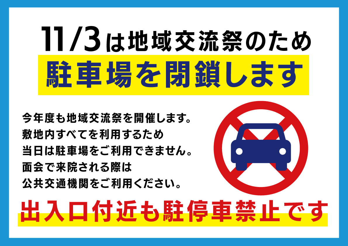 病院からのお知らせ 11/3(日/祝)地域交流祭に伴い【駐車場が利用できません】 2024/10/09 日頃より当院の診療等にご理解とご協力をいただき、ありがとうございます。 今年も11月3日に「地域交流祭」を開催することとなりました。 つきましては、当日(11月3日)にお見舞いにお越しの際は、当院の駐車場が利用できません。(敷地内に車を乗り入れることもできません) また、当日は敷地に入る前から大変混み合うことが予想されます。 ご迷惑をおかけいたしますが、何卒ご理解いただきますようお願い申し上げます。 院長 福西