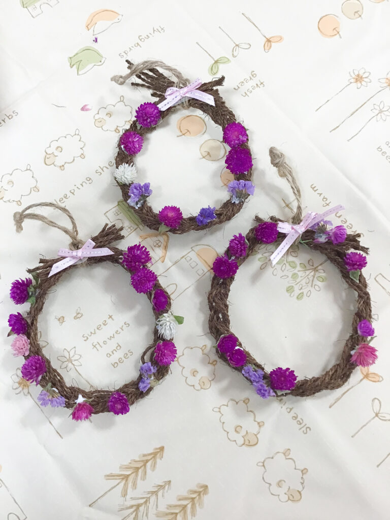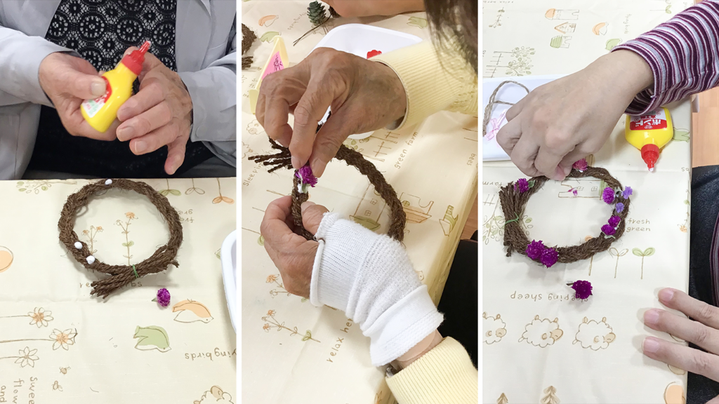 今回はリースの輪を「編む」作業がありましたが、みなさん迷うことなくキレイに編み込んで十分な長さのリースの輪を作っていました。「三つ編みなんて久しぶりだわ〜」と言いつつ、手が覚えているものです。編み込んだリースの輪ができたら、院内で育てた花(ドライフワラー済)をデコレーションしていきます!
