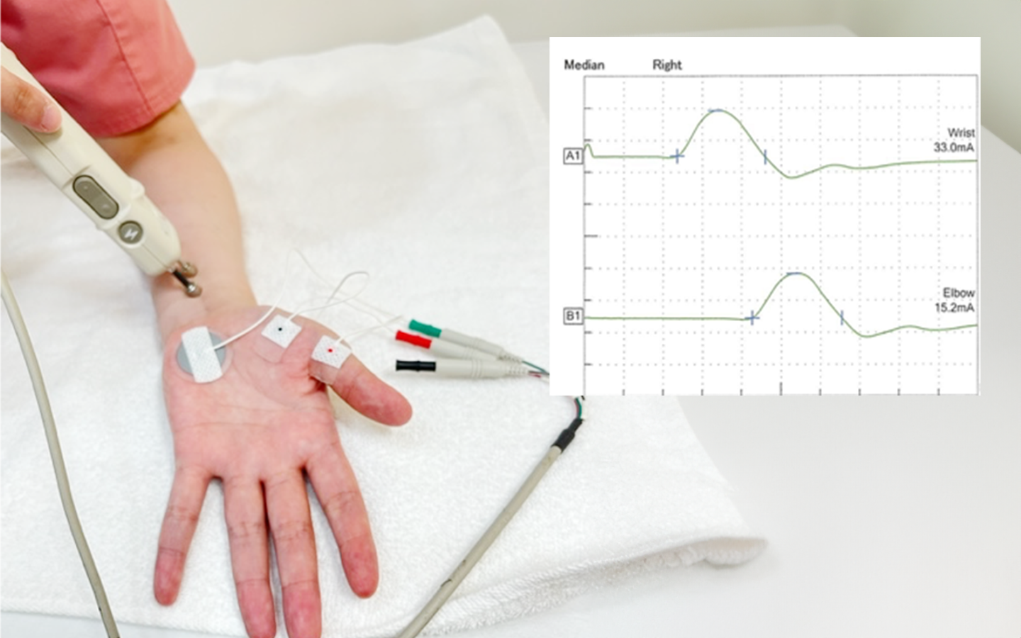 検査では、腕の神経に電気を流し、手のひらへ伝わるまでの時間や伝わったときの波形を計測することで神経細胞に損傷がないかどうかを調べることができます。腕の神経に電気を流す際、静電気がパチッと流れるときのような痛みが何度かありますが検査前に必ず「説明」と「お声掛け」しますのでご安心ください。