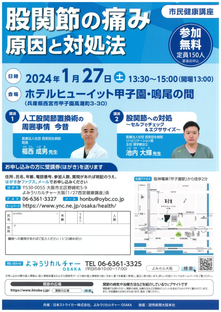 この度、よみうりカルチャーOSAKA「西宮健康講座」に福西院長と理学療法士の池内が登壇します。