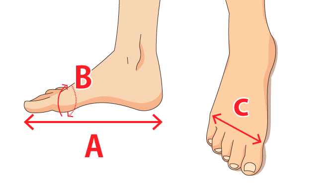 - (C)足幅:第1中足骨頭と第5中足骨頭の距離(母趾と小趾の最もでている部分の距離)