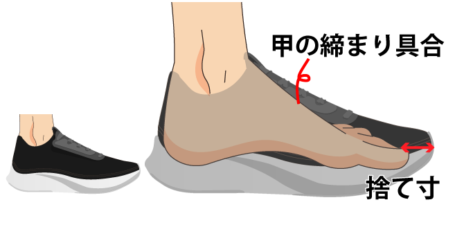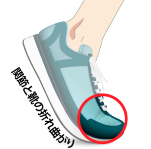 まず靴ひもを通して、足を入れます。そして、踵を上げて、足囲を図った関節と靴の折れ曲がりが一致するか、靴が自分にあっているか確認するときの参考にしてみてください。また、人は左右で大きさが違うことも多いため、シューズを履くときは必ず両足とも履くようにしましょう。