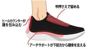 靴ひもをほどかずに着脱すると、アッパーが伸びて固定性がなくなったり、踵部を強く引っ張ることでヒールカウンターが崩れてしまったりする場合があります。急いでいるときなど、強引に履いたり脱いでしまいがちですが、靴を着脱するときは、「靴ひもをほどく」という習慣をつけることも大切です。