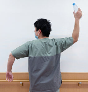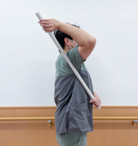 【チェック方法】棒やバッドを写真のように持ち、胸を張ったり背中を丸めたりした時に肩に張り感や痛みがでないかどうかをチェックします。