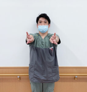 【チェック方法】俗に言う「前ならえ」の姿勢で腕を内側に捻っていき、両手の小指同士が接触するかどうかをチェックします。