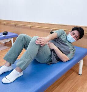 小指を上に向け、膝の外側をしっかり触ることができれば機能良好と言えます。