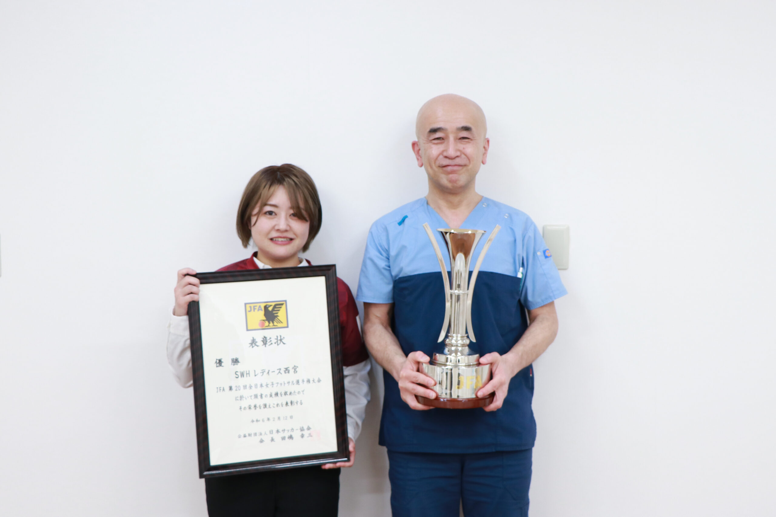 当院がスポンサーをしているSWH西宮 Futsal Clubが2023-2024シーズン全日本女子フットサル選手権大会にて優勝し、三津山選手を含め優勝の報告に来院いただきました。