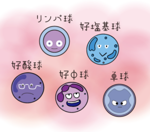 白血球は、身体に進入してくる異物(病原菌など)を取り込んで消化し、身体を守る防御作用があります。白血球には大きく分けて5つの種類があります。