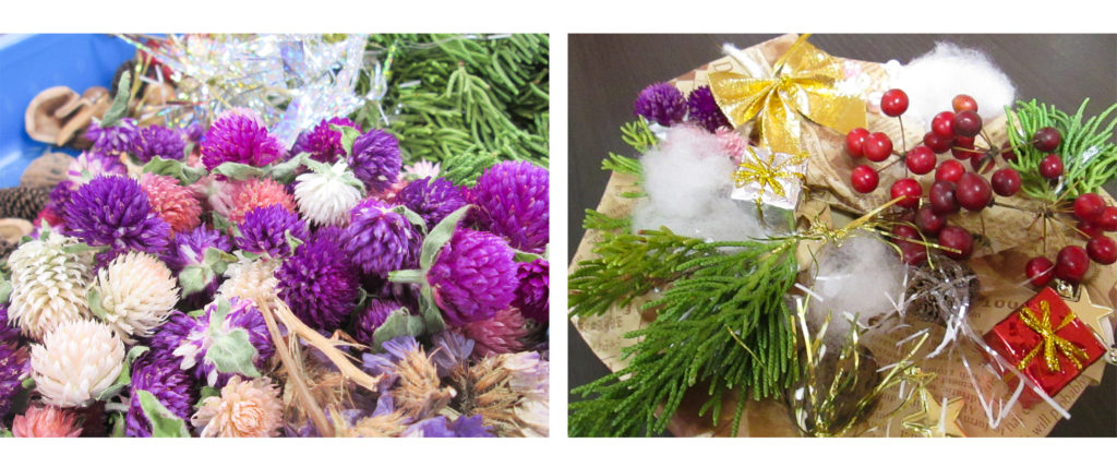 使用したのは「千日紅」という花と松ぼっくりやくるみなどでした。