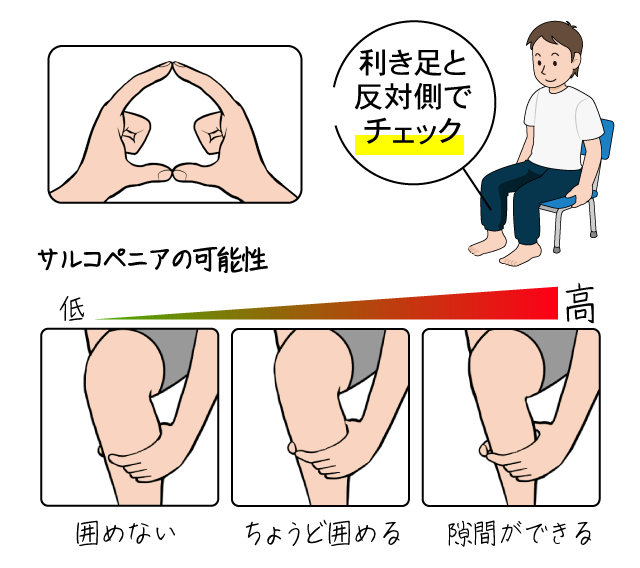- 作った輪っかの囲みで「すき間ができる」場合はサルコペニアが疑われます