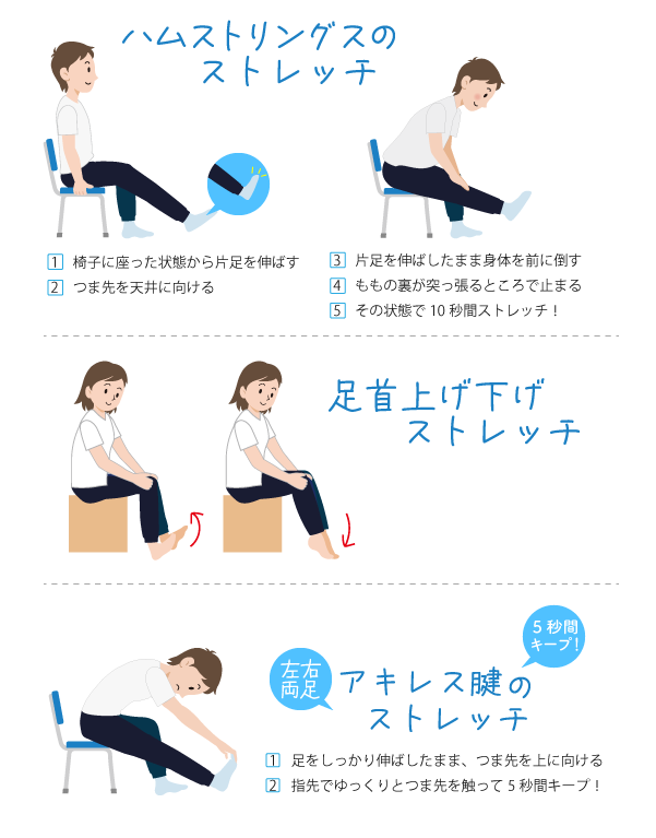 どうしても⻑時間、座りっぱなしになってしまう場合は、座ったままできる予防法を取り入れることも回避に繋がります。