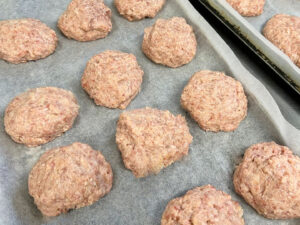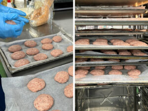 当院は、患者さんと同じメニューを職員も食べているため、この日の夜勤を担当する職員の人数分も成形し天板に並べたら、オーブンで一気に焼き上げます。